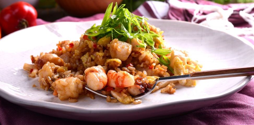 Agregar los pimientos rojos cortados en pequeños cubos, un poco de pasta de ajo y el jengibre. Dorar unos segundos e incorporar el arroz cocido. Saltear durante unos segundos.